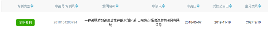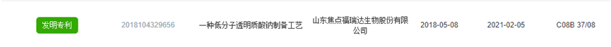 通过燕京啤酒京东旗舰店页面展示的透明质酸专利号,银柿财经在专利查询系统查到,其透明质酸钠或来自山东焦点福瑞达生物股份有限公司(以下简称“焦点福瑞达”)。
