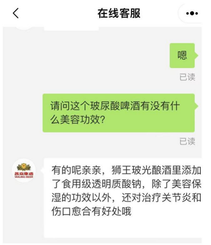 上架后的玻光酿迅速成为市场的关注热点,有网友晒出了自己与燕京啤酒线上渠道客服的咨询截图,图中可见,在被问及玻尿酸啤酒有什么美容功效时,头像为燕京啤酒的客服称:“添加了食用级透明质酸钠,除了美容保湿的功效以外,还对关节炎和伤口愈合有好处。”