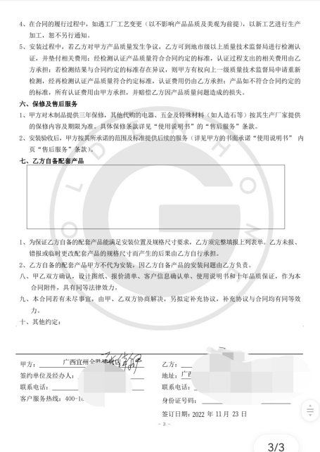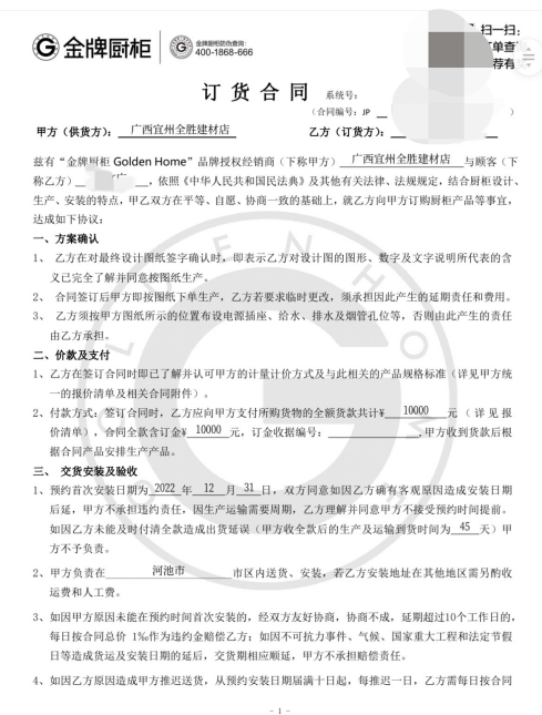 苗女士向银柿财经出示的订货合同显示,甲方为此次“跑路”的“金牌厨柜 Golden Home”品牌授权经销商“广西宜州全胜建材店”,乙方为苗女士方面,可以看出合同使用的是金牌厨柜的统一模板,左上角和水印都有金牌厨柜的品牌标识。苗女士告诉银柿财经,合同落款签字人系老板娘张某,老板为郑某。