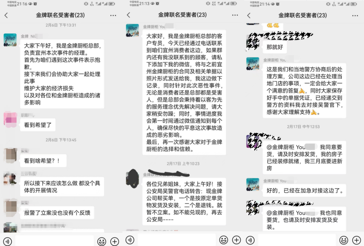 苗女士提供的受损消费者维权群聊的截图显示,金牌厨柜方面于2月6日第一次在维权群中发声,表示将协助消费者一起处理该事件;经数日协商,2月17日,群内有消费者称接到警方转告,金牌厨柜方面将为受损投资者买单,一是按原订单发货安装,二是退钱,暂不立案,如不能兑现再找警方。