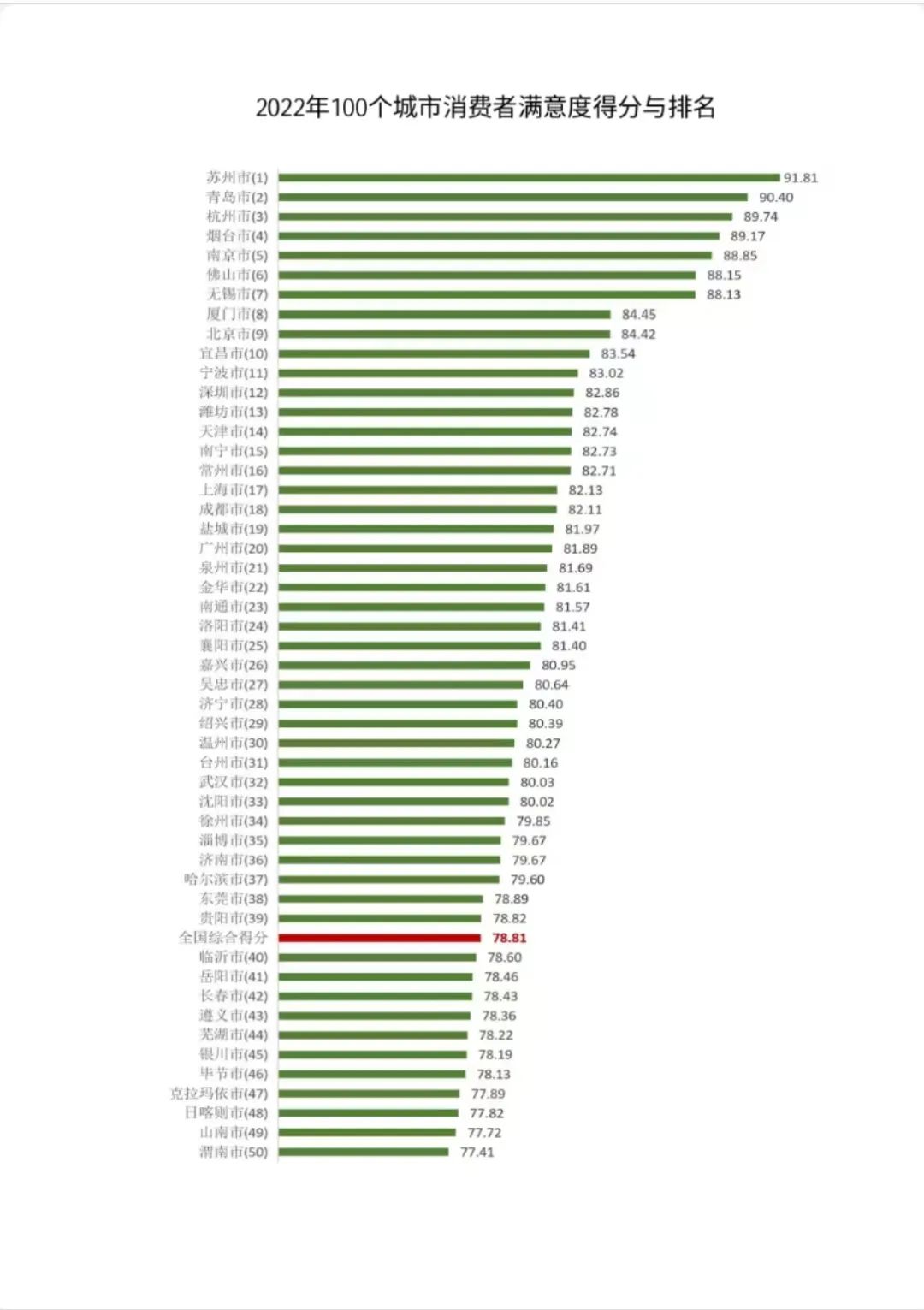 苏州、青岛、杭州、烟台、南京、佛山、无锡、厦门、北京、宜昌位居100个城市消费者满意度综合得分第1至10名。