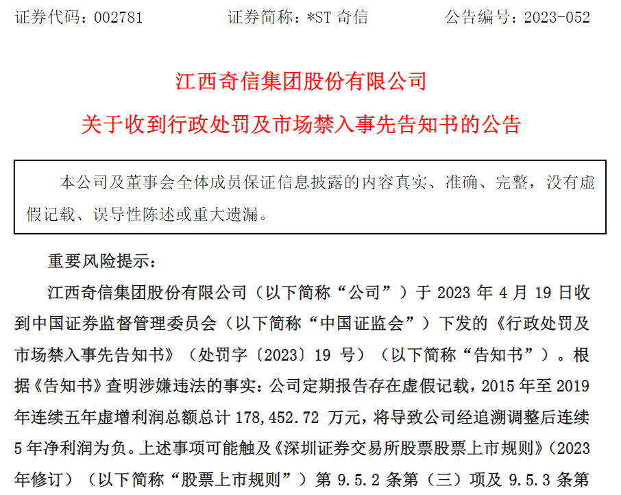 4月19日晚间,*ST奇信发布公告称,公司于2023年4月19日收到中国证监会下发的《行政处罚及市场禁入事先告知书》,因公司定期报告存在虚假记载,2015年至2019年连续五年虚增利润总额总计17.85亿元,将导致公司经追溯调整后连续5年净利润为负,或触及重大违法强制退市情形。
