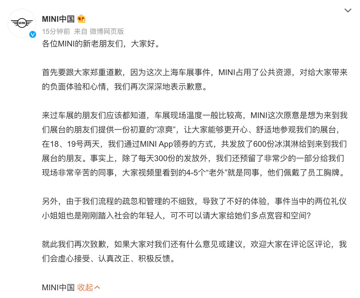 同时宝马MINI表示,“另外,由于我们流程的疏忽和管理的不细致,导致了不好的体验,事件当中的两位礼仪小姐姐也是刚刚踏入社会的年轻人,可不可以请大家给她们多点宽容和空间?”