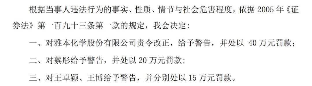 回顾雅本化学一案,2020年9月10日,雅本化学发布公告称收到了证监会的《行政处罚决定书》。证监会经调查认定,公司涉嫌误导性陈述等信息披露违法违规情况。