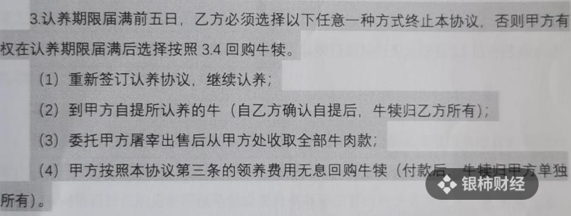 而认养期限届满前5日,乙方可以选择多种方式终止协议,其中包括甲方按照领养费用无息回购牛犊(付款后,牛犊归甲方单独所有),按照业务员的说法,这就是“拿回全部本金”的意思。
