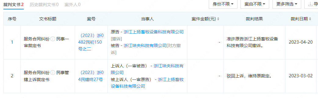 企查查还显示,2023年2月,浙江味央因未能履约支付服务费,被浙江上扬畜牧设备科技有限公司(以下简称“上扬畜牧”)告上法庭,一审上扬畜牧胜诉后,浙江味央进行申诉,对上扬畜牧未能提供全过程的咨询管理服务及一审法院管辖权两点提出异议,但在二审过程中被驳回。