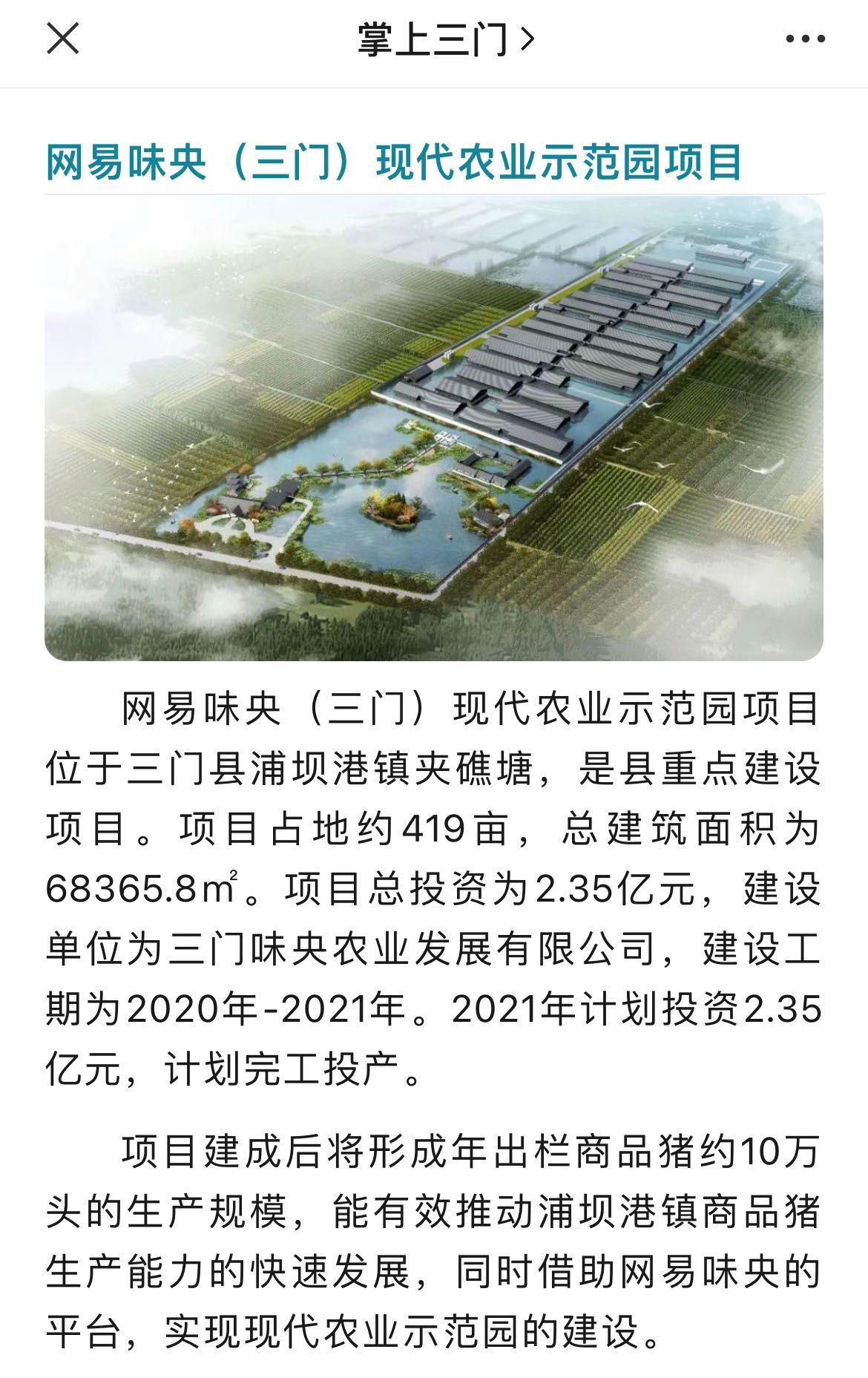 银柿财经梳理公开信息,2019年12月,三门新闻网曾发布《网易要在三门养猪了》,三门县人民政府官网也转发这一消息,其中提到,网易味央(三门)现代农业示范园项目位于三门县浦坝港镇夹礁塘,是县重点建设项目。项目占地约419亩,总建筑面积为68365.8平方米,项目总投资为2.35亿元,建设单位为三门味央农业发展有限公司,建设工期为2020年~2021年。项目建成后将形成年出栏商品猪约10万头的生产规模。