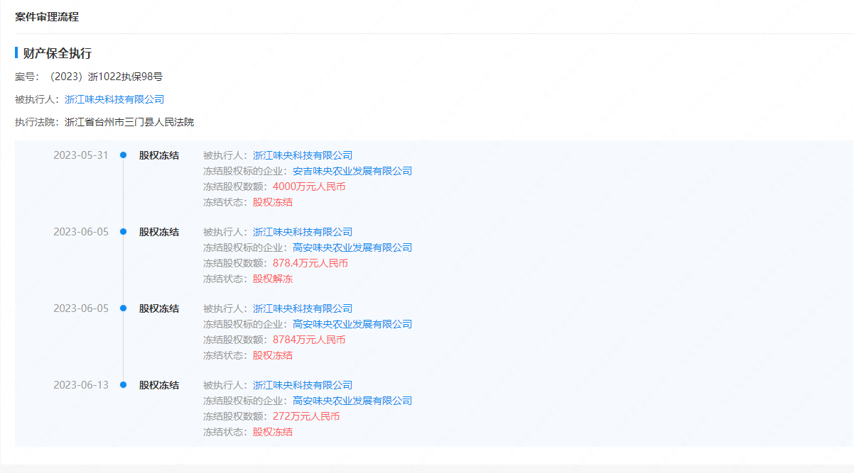 股权冻结信息中,执行法院均为浙江省台州市三门县人民法院,浙江味央的案件身份为“财产保全执行被告”。财产保全案件,指的是法院对于可能因当事人行为导致判决不能执行或难以执行的案件,在对该案判决前,依法对诉讼标的物或与本案有关的财物采取的强制性措施。