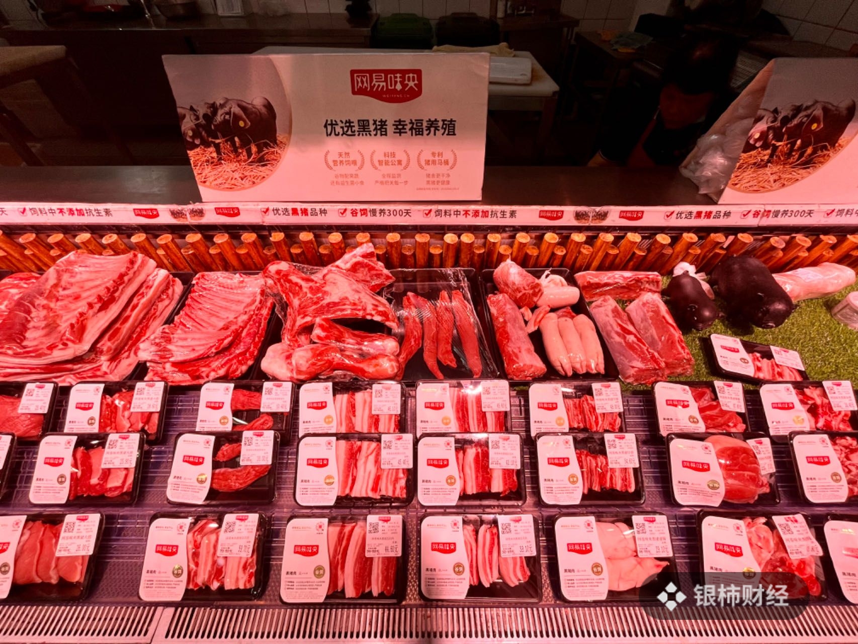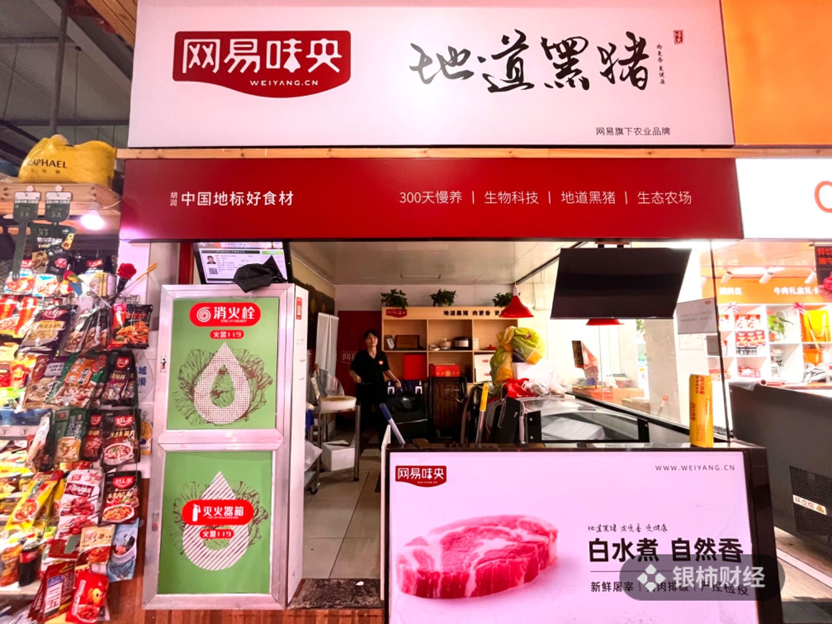 2017年,网易味央开始入驻杭州16家世纪联华商超专柜,其中,杭州西湖文化广场的世纪联华鲸选店是网易味央的首家线下门店。6月12日,银柿财经前往西湖文化广场店探访。网易味央专柜内,排骨、五花、前腿、后腿等猪肉产品品类丰富。商超专柜产品的宣传资料显示,网易味央黑猪品种是“太湖黑猪”,实行的是“慢养300天”“谷蔬饲养”“饲料中不添加抗生素”“猪用马桶”“智慧公寓”等养殖方式。