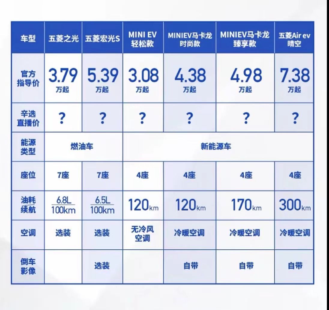 以五菱宏光MINI EV马卡龙时尚款为例,官方指导价约4.38万元。在直播间的售价为3.85万元。五菱宏光S的官方指导价为53900元,在直播间的售价为5万元。