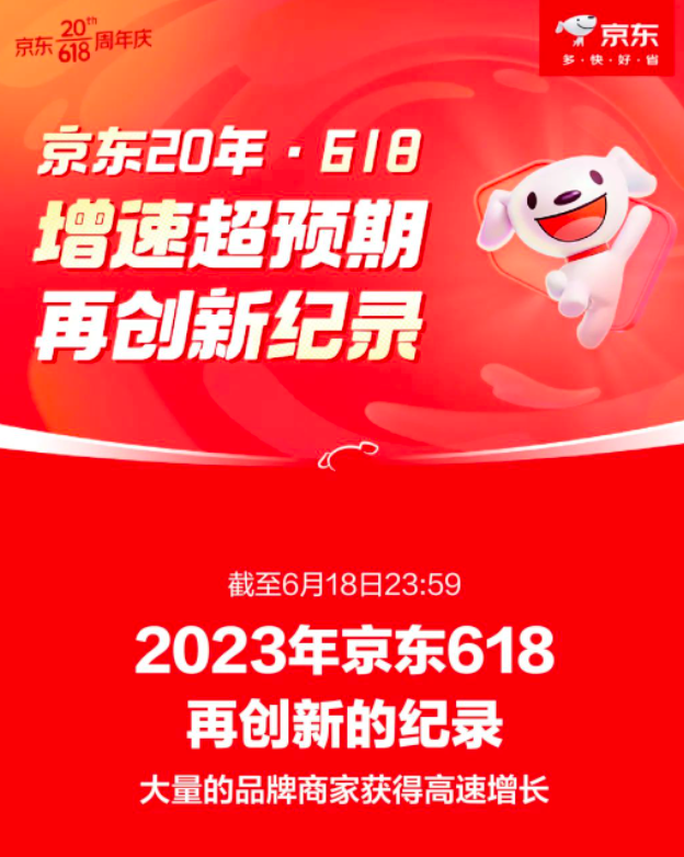 6月19日,京东发布截至6月18日23:59的大促成绩单。京东表示,2023年京东“618”增速超预期,再创新的纪录,大量的品牌商家在这个京东“618”获得了亮眼的增长。