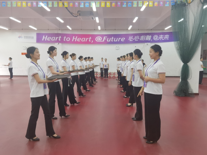 “您好,请跟我来!”记者看到,集训现场,上百位来自浙江大学等高校的女学生整齐划一地举起右臂,倾斜角度统一在30°,她们面带亲和的微笑,温柔的声音汇成清脆响亮的问候语;另一间集训教室内,浙江传媒学院的女生们双手托着托盘,手臂维持成漂亮的直线,没有一丝动摇……