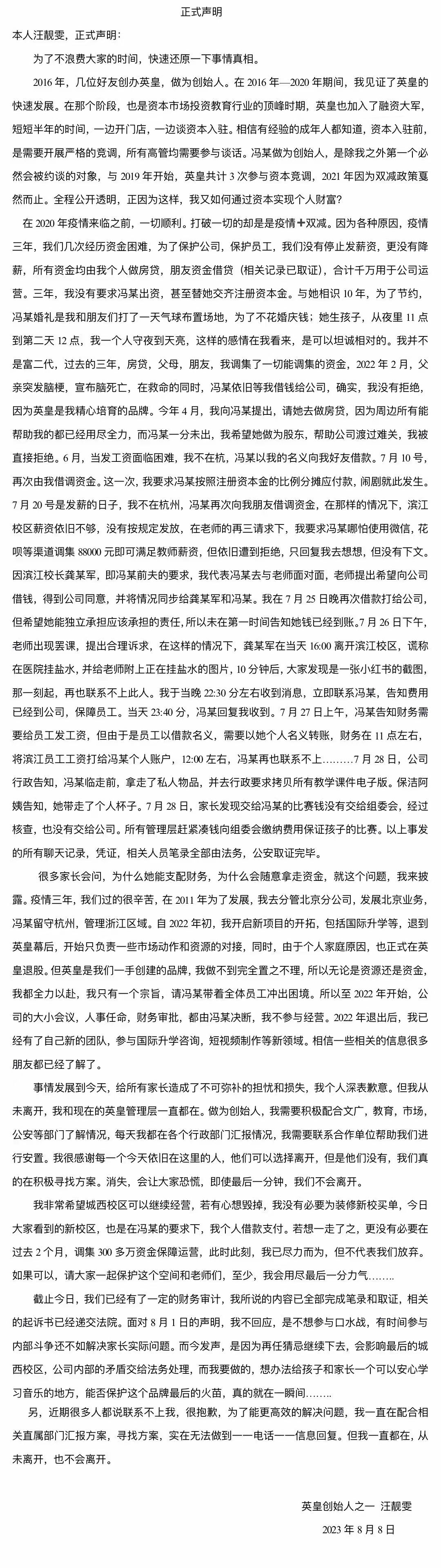 随后机构两位创始人发出的个人声明让家长的不安持续升级。8月1日,英皇国际音乐中心创始人之一冯妍在朋友圈发文控诉英皇实际控制人汪靓雯借着英皇的平台玩资本游戏、创造个人财富,“公司的法人章、公章、营业执照都在不知情的情况下被拿走”“7月26日之后盖章事项均与本人无关”等表述,显然是想和机构近期的舆论风波撇清关系。一周后的8月8日,另一位创始人汪靓雯发布个人声明,称疫情三年机构持续面临资金周转困难,同为股东的冯妍未尽到合伙人义务,拒不出资并挪用员工工资和学生报名参赛费用。
