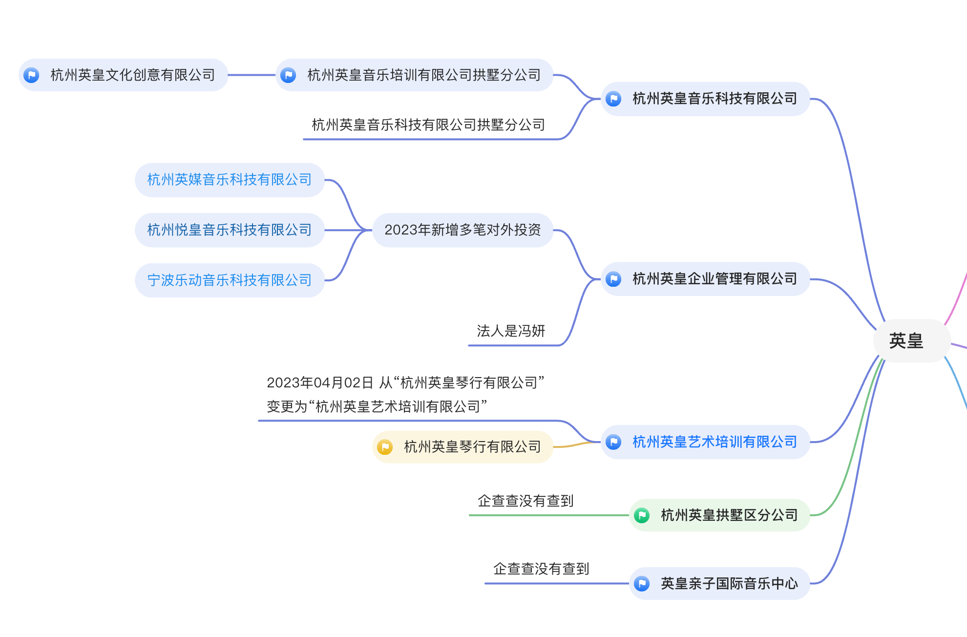 爱企查显示,冯妍目前关联企业14家,其中担任法人代表10家,大部分为杭州英皇音乐科技有限公司旗下分公司,其中关联风险13项。汪靓雯目前关联企业15家,其中担任法人代表4家,实际控制企业12家,其中,由汪靓雯担任法人代表的杭州英皇控股集团有限公司在过去两年经历了多次法人代表、实际控制人、最终受益人等变更,2023年2月8日,注册资本从“5000万元人民币”减少到“1000万元人民币”,被提示为“中风险”,同日,经营范围发生了变更,或已不再具备教育培训资质。