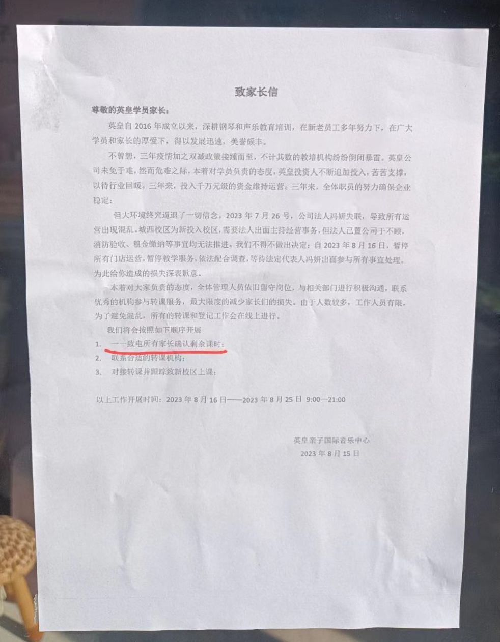 8月16日,城西校区贴出“致家长信”,确定该机构即日起暂停所有门店运营,并表示会一一和家长确认剩余课时,并转接至其他培训机构,该项工作将截止到8月25日。