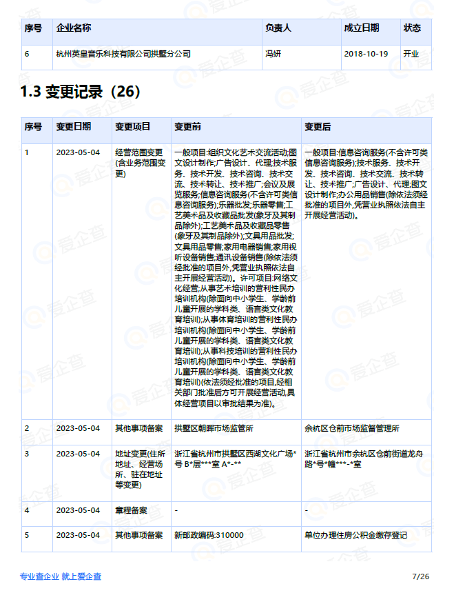 2017年12月21日,投资人由龚少军、汪靓雯变更为吴月琴、李明珠、龚少军、汪靓雯;企业名称由杭州英皇文化创意有限公司变更为杭州英皇音乐培训有限公司;2018年4月11日,投资人由吴月琴、李明珠、龚少军、汪靓雯变更为冯妍(监事)、汪靓雯(执行董事兼总经理),两名创始人从此绑定。2020年12月28日,杭州英皇音乐培训有限公司正式更名为杭州英皇音乐科技有限公司。