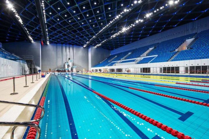 一池碧水,在屋顶自然光的渗透下波光粼粼。杭州奥体中心游泳馆是仅次于水立方的全国第二大游泳跳水馆,杭州亚运会期间将举办游泳、跳水和花样游泳等比赛,共产生53枚金牌,是产生金牌数量最多的亚运场馆。
