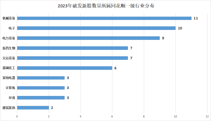 同花顺iFinD数据显示,破发的69家公司中,23家所属证监会行业为制造业,占比33.3%,由此可见制造业是2023年以来新股破发“重灾区”。而这69家破发企业中,所属的同花顺一级行业以机械设备、电子、电力设备居多,分别有11家、10家、9家,分别占比15.9%、14.4%、13%。