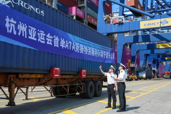 金秋九月,西子湖畔,国际性体育赛事杭州亚运会即将举办,各类赛事所需进境物资也陆续到港。