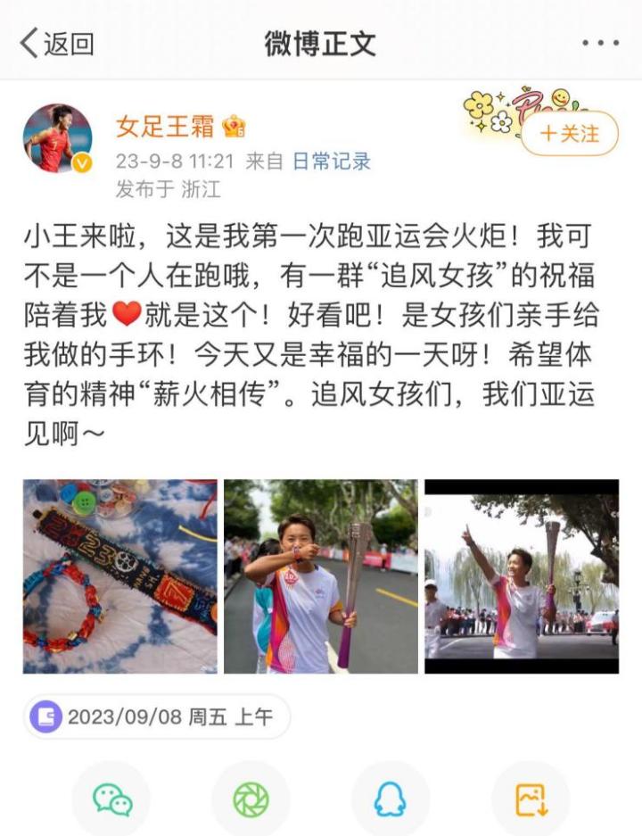 “这是我第一次传递亚运火炬,很荣幸,也很激动。今天也戴了一个特别的手环来传递火炬,这是云南宣威一群大山里的追风女孩亲手制作送给我的礼物。”王霜在传递火炬后接受潮新闻记者采访时表示,“我也希望体育精神能够‘薪火相传’,希望所有喜欢足球的女孩都能追风不止!”