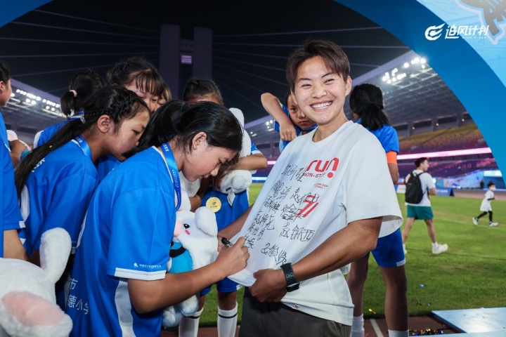 潮新闻记者参加了今年的首届追风联赛总决赛,王霜给获得冠军的云南宣威靖外明德小学颁奖,还跟这群追风女孩许下一个约定,来杭州亚运会为中国女足加油。