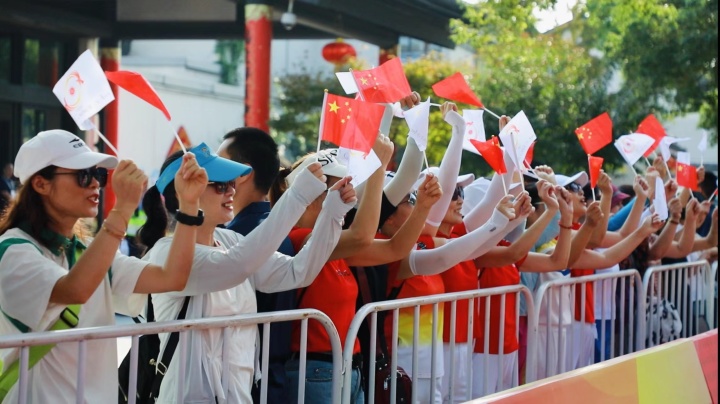 今天,是令绍兴人十分激动的一天。一大早,鲁迅故居附近聚集了许多围观市民。“绍兴加油!加油!”现场欢呼声、呐喊声此起彼伏,还有人脸上贴着国旗小图标,摇动五星红旗、亚奥理事会会旗……