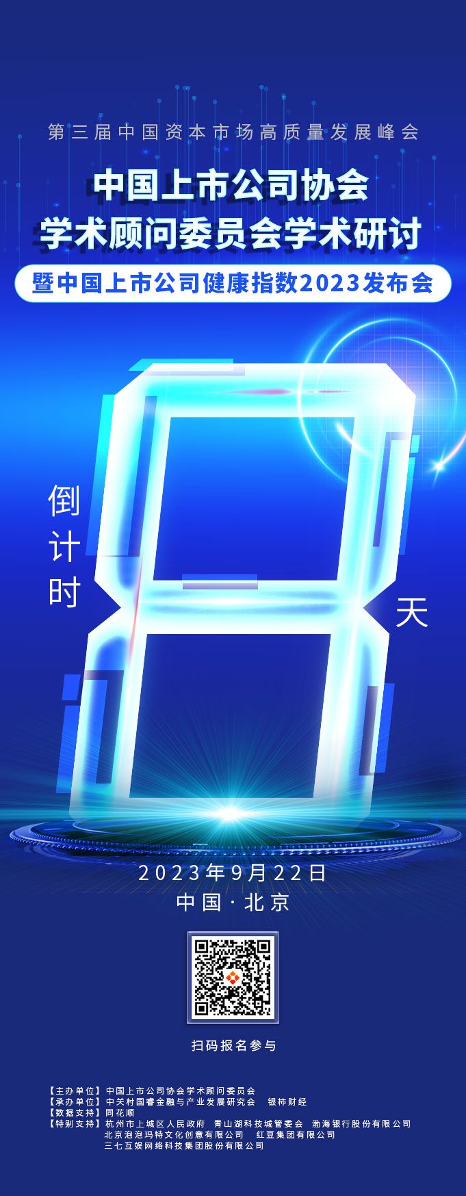 如何看待当前宏观经济形势,如何促进资本市场投融资平衡、引入更多中长期资金?如何进一步优化交易机制、更好保护中小投资者?对市场建设者和参与者而言,还有一系列课题需要思考和解决。为落实“活跃资本市场、提振投资者信心”的要求,更好促进资本市场平稳健康发展,9月22日,中国上市公司协会学术顾问委员会学术研讨暨中国上市公司健康指数2023发布会将在北京召开,知名专家学者、上市公司和相关机构代表将在会上就上市公司如何促发展、强信心进行深入讨论。会议将围绕“创新引领 共赋价值”的主题,为中国资本市场把脉,为健康发展献“良方”。届时,我们不见不散!