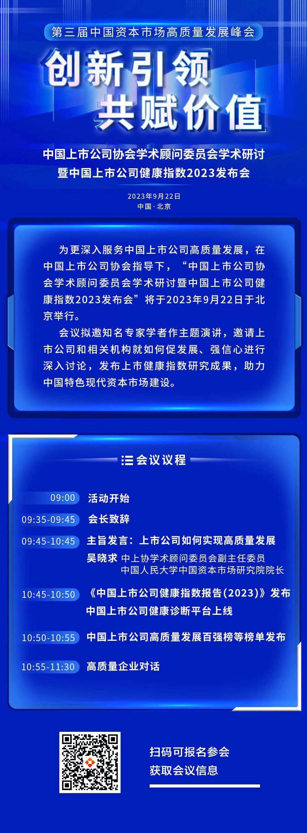 9月22日,中国上市公司协会学术顾问委员会学术研讨暨中国上市公司健康指数2023发布会将在北京召开。在这次会议上,知名专家学者、上市公司和相关机构代表将就上市公司如何促发展、强信心进行深入讨论。会议将围绕“创新引领 共赋价值”的主题,为中国资本市场把脉,为健康发展献“良方”。