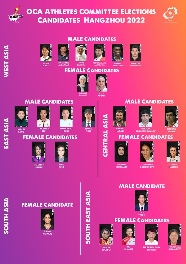 据悉,本次竞选共26名候选人参与选举,分别来自西亚、中亚、南亚、东南亚、东亚5个竞选分区,最终将选出10位委员,任期为4年。对参与的运动员候选人来说,也将有许多的要求,比如没有在比赛中使用过兴奋剂,且至少参与过一届亚运会。