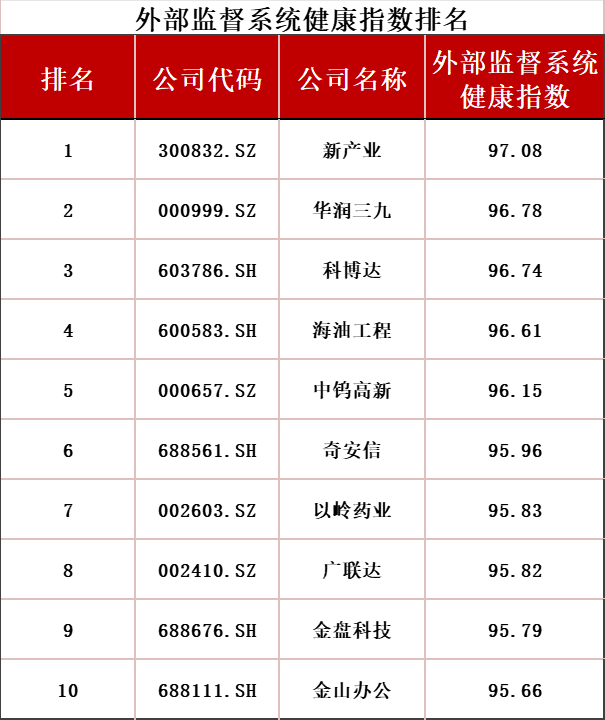 外部监督方面,2022年该系统平均健康指数为78.64,反映了上市公司在政府监管环境和法律环境中的行为规范程度、监管关注程度,以及公司与社会的互动情况。这些因素能够影响投资者的信心和决策,从而间接影响公司的市值。剔除金融地产后,全市场外部监督系统健康指数排名前10的公司分别是:新产业(300832.SZ)、华润三九(000999.SZ)、科博达(603786.SH)、海油工程(600583.SH)、中钨高新(000657.SZ)、奇安信(688561.SH)、以岭药业(002603.SZ)、广联达(002410.SZ)、金盘科技(688676.SH)、金山办公(688111.SH)。