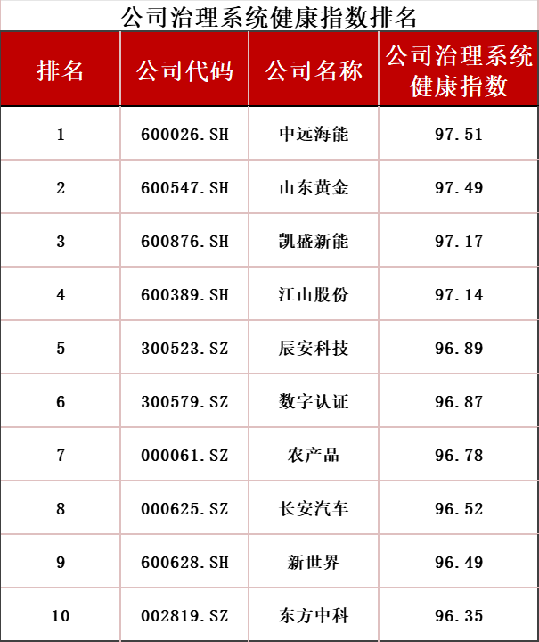 公司治理方面,2022年该系统的平均健康指数为85.08,同比增长6.11。这一平均健康指数大幅上涨,凸显了公司治理不断完善的趋势——上市公司在构建有效董事会结构、提高管理水平和监事会履职能力、提升信息披露规范程度等方面取得了明显进步。在剔除金融地产后,全市场公司治理系统健康指数排名前10的公司分别是中远海能(600026.SH)、山东黄金(600547.SH)、凯盛新能(600876.SH)、江山股份(600389.SH)、辰安科技(300523.SZ)、数字认证(300579.SZ)、农产品(000061.SZ)、长安汽车(000625.SZ)、新世界(600628.SH)、东方中科(002819.SZ)。