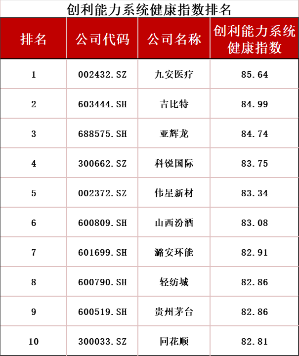 创利能力方面,2022年该系统平均健康指数为58.47,同比略低0.28。这一数据揭示着反映了公司在创造利益、产生现金流以及提升内在价值方面的能力。剔除金融地产后,全市场创利能力系统健康指数排名前10的公司分别是:九安医疗(002432.SZ)、吉比特(603444.SH)、亚辉龙(688575.SH)、科锐国际(300662.SZ)、伟星新材(002372.SZ)、山西汾酒(600809.SH)、潞安环能(601699.SH)、轻纺城(600790.SH)、贵州茅台(600519.SH)、同花顺(300033.SZ)。