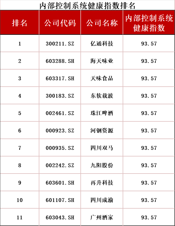 内部控制方面,该系统在2022年平均健康指数为83.22。内部控制系统的评价主要借鉴了《企业内部控制基本规范》所总结的五要素,包括控制环境、风险评估、控制活动、信息与沟通、内部监督五个维度。通过建立和维护有效的内部控制系统,公司能够提高经营效率、提高财务可靠性、预防欺诈行为,并为投资者和利益相关方提供信心和透明度。剔除金融地产后,2022年全市场内部控制系统健康指数排名并列前10的公司分别是:亿通科技、海天味业(603288.SH)、天味食品(603317.SH)、东软载波(300183.SZ)、珠江啤酒(002461.SZ)、河钢资源(000923.SZ)、四川双马(000935.SZ)、九阳股份(002242.SZ)、再升科技(603601.SH)、四川成渝(601107.SH)、广州酒家(603043.SH),均为93.57分。