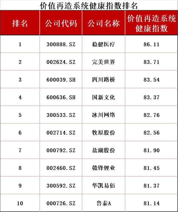 价值再造系统是指上市公司通过组织和运用各类资源,贯穿整个产业链,重新组织和优化价值链,实现可持续增长和企业的发展壮大的能力体系。2022年该系统平均健康指数为60.25,剔除金融地产后,2022年全市场价值再造系统健康指数排名前10的公司分别是:稳健医疗(300888.SZ)、完美世界(002624.SZ)、四川路桥(600039.SH)、国新文化(600636.SH)、冰川网络(300533.SZ)、牧原股份(002714.SZ)、盐湖股份(000792.SZ)、赣锋锂业(002460.SZ)、华凯易佰(300592.SZ)、鲁泰A(000726.SZ)。