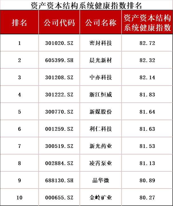资产资本结构方面,该系统在2022年的平均健康指数为56.79。企业通过评估和优化资产资本结构,可以提高财务稳定性、降低风险,优化资金利用效率,增强企业的盈利能力和抗风险能力。剔除金融地产后,2022年全市场资产资本结构系统健康指数排名前10的公司分别是:密封科技(301020.SZ)、晨光新材(605399.SH)、中亦科技(301208.SZ)、浙江恒威(301222.SZ)、新媒股份(300770.SZ)、利仁科技(001259.SZ)、新光药业(300519.SZ)、凌霄泵业(002884.SZ)、晶华微(688130.SH)、金岭矿业(000655.SZ)。