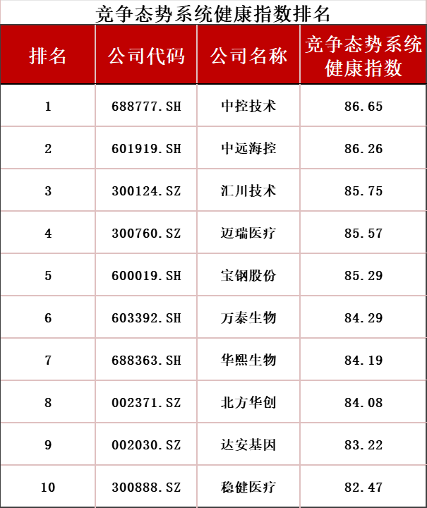 竞争态势系统,是指上市公司在行业内与其他企业之间形成的竞争关系和状态,2022年,该系统平均健康指数为50.47。全市场竞争态势系统健康指数排名前10的公司分别是:中控技术(688777.SH)、中远海控(601919.SH)、汇川技术(300124.SZ)、迈瑞医疗(300760.SZ)、宝钢股份(600019.SH)、万泰生物(603392.SH)、华熙生物(688363.SH)、北方华创(002371.SZ)、达安基因(002030.SZ)、稳健医疗(300888.SZ)。