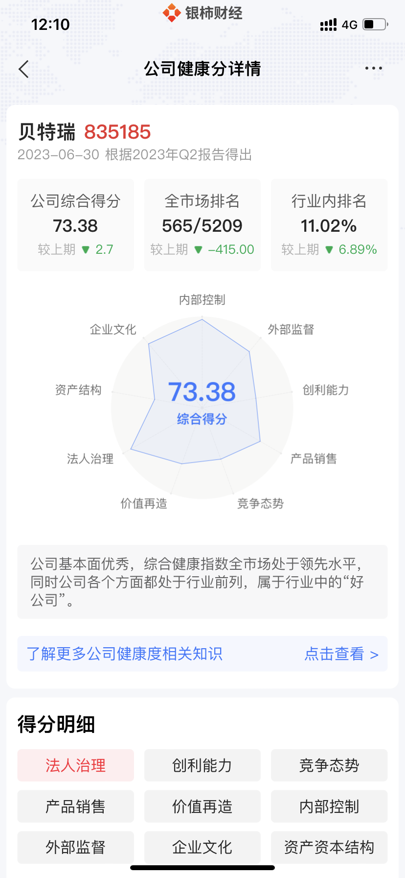 据上市公司健康指数诊断平台,截至今年6月30日,贝特瑞综合得分73.38,在全市场5209家公司中,排名为565位,行业内排名为前11.02%,“公司基本面优秀,综合健康指数全市场处于领先水平,同时公司各个方面都处于行业前列”。