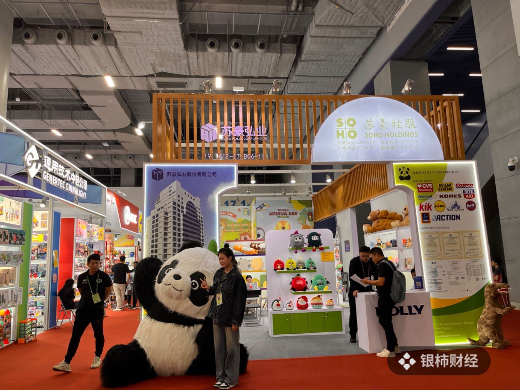 比起积木、童车等展区,毛绒玩具展区相对来说比较热闹,尤其是苏豪宏业展位门口“大只”熊猫十分惹眼。